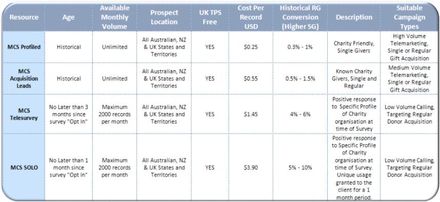 Pricing is tailored to the specific order, prices will vary based on make-up and volume of the leads we recommend based on your fundraising objectives. The table below outlines some general pricing but is provided as a guide rather than a quote of exact costs, as we would always work to meet your resource needs within your allocated budget.